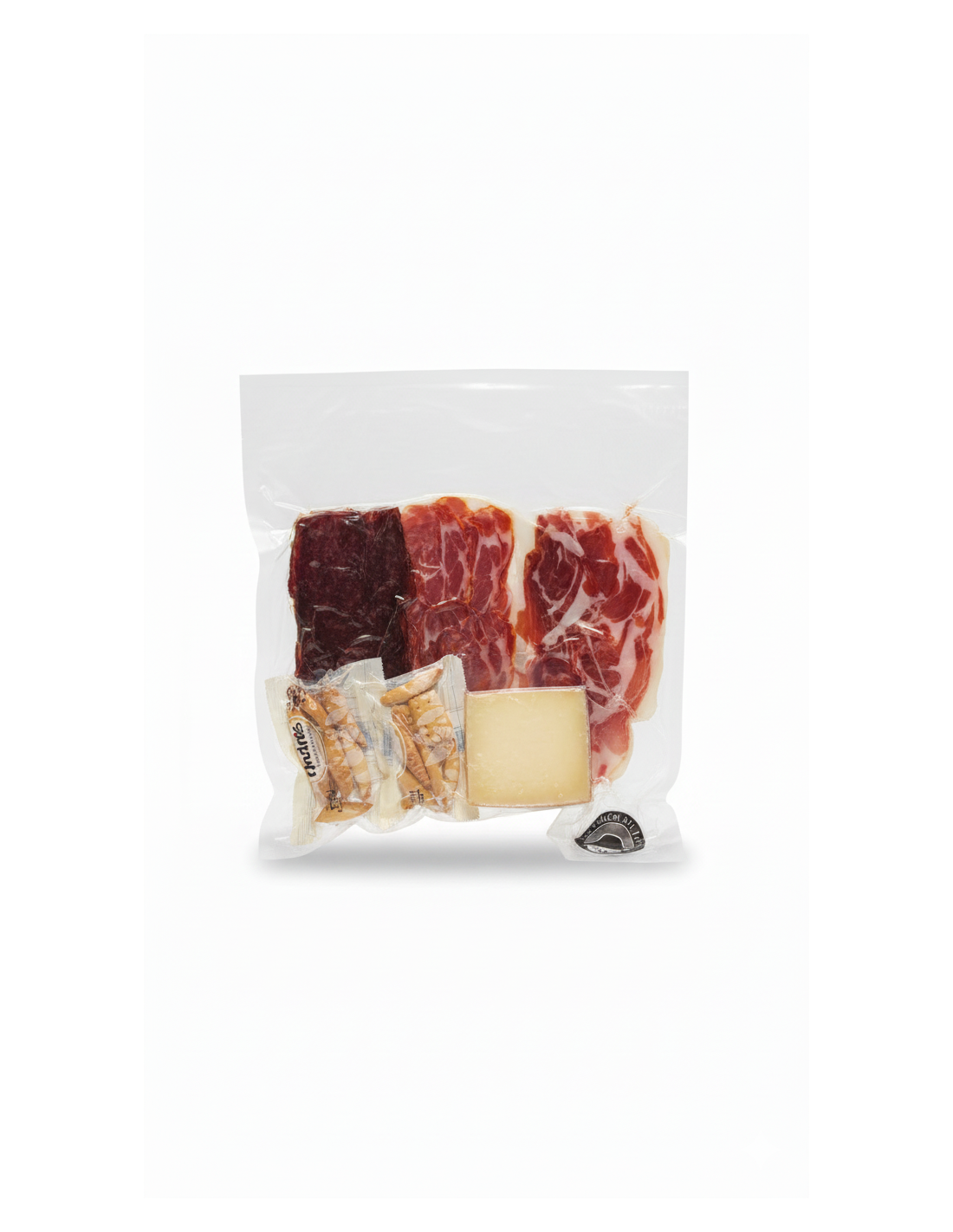 The structure of this set is designed for contrast: the subtle smokiness of the Cecina is balanced by the juiciness of the Iberian Ham. The powerful flavor of the Aged Cheese is perfectly complemented by the lean touch of the loin. The 'picos camperos' provide the ideal crunchy element.