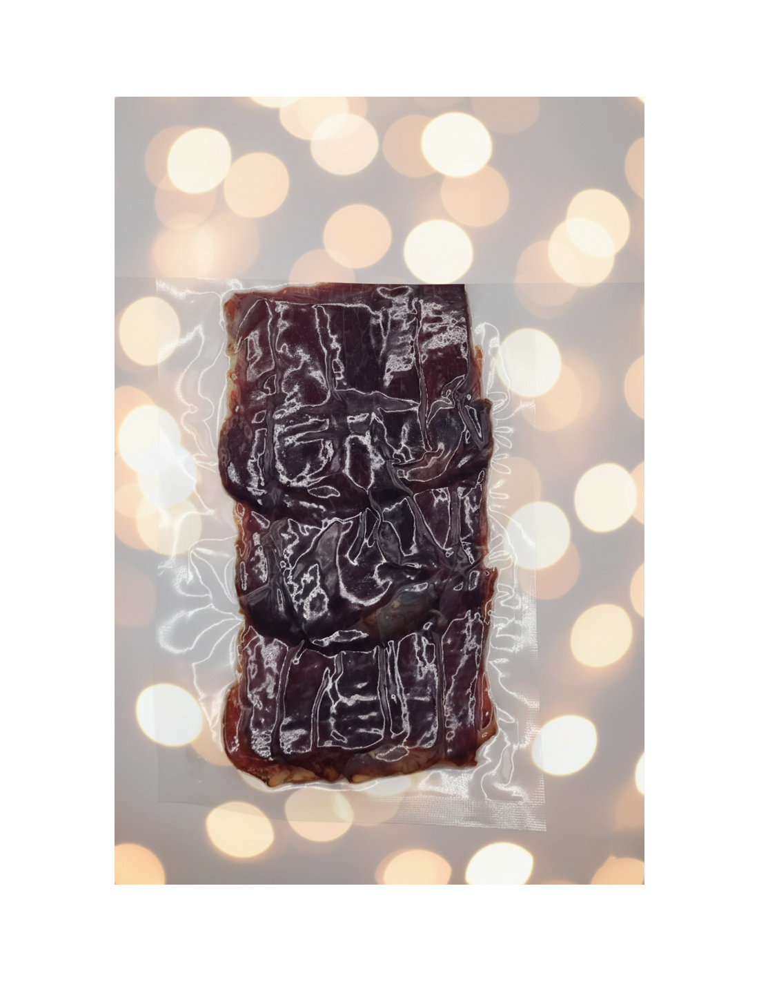 Our Smoked Cecina de León, presented in a convenient 100-gram sliced format, is a traditional delicacy with a Protected Geographical Indication (PGI) status. Unlike ham, this exquisite product is made exclusively from selected cuts of beef.