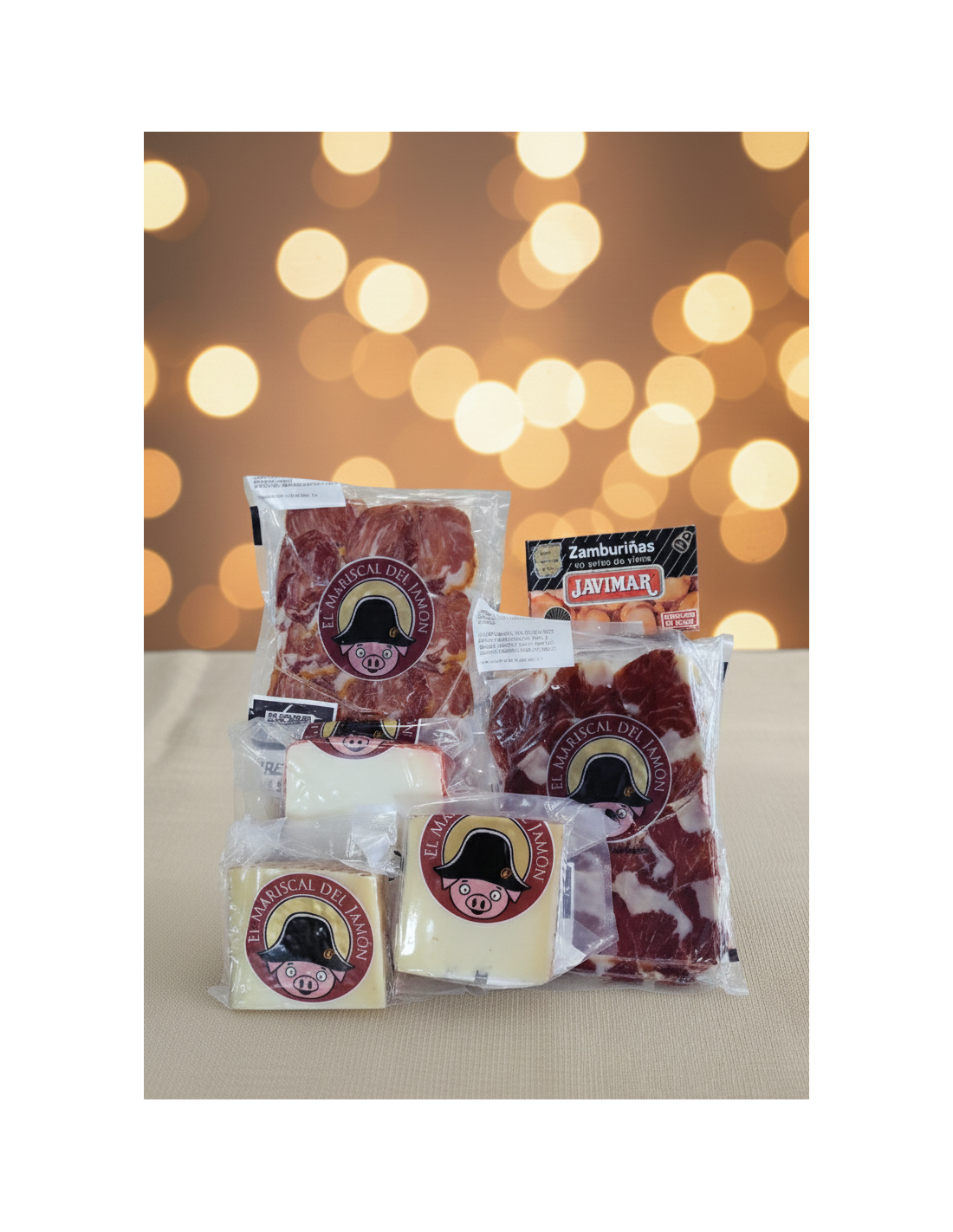 El pack de lujo definitivo. Disfrute del Jamón y Lomo Ibérico de Bellota (máxima calidad), un surtido de tres quesos, lata de conservas aleatoria(berberechos, zamburiñas....) y dos bolsas de picos.