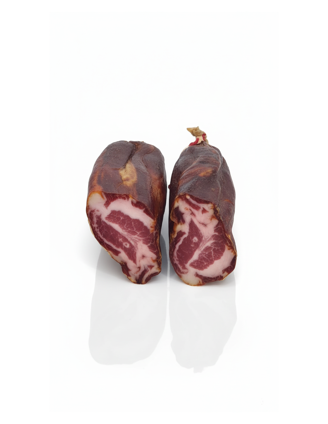 Elaborada siguiendo el método artesanal, la pieza se adoba con pimentón, ajo y especias naturales, y se somete a un proceso de curación lenta y controlada en secaderos naturales. El resultado es un manjar de color rojo intenso y textura suave, perfecto para degustar en finas lonchas.