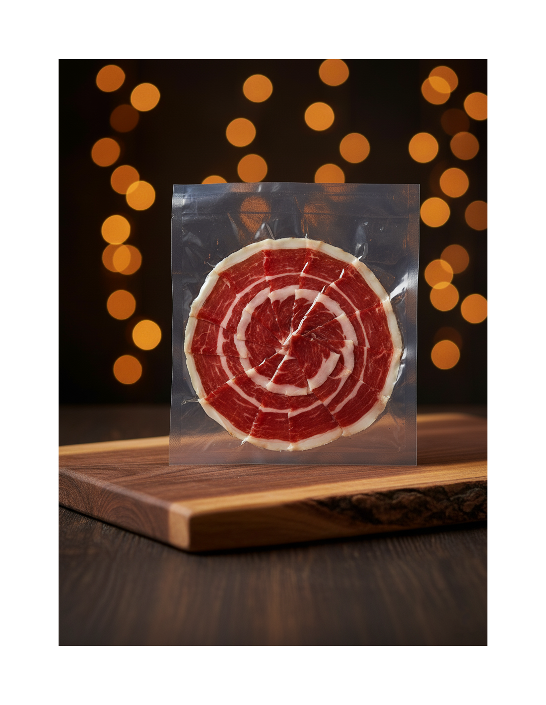 Le Jambon de Cebo Campo Ibérique 50% Race Ibérique tranché est la manière la plus pratique de profiter de la qualité supérieure qu'apporte l'élevage en semi-liberté. Chaque sachet de 100 grammes contient des tranches parfaitement coupées à la machine et emballées sous vide pour préserver l'essence de sa saveur.